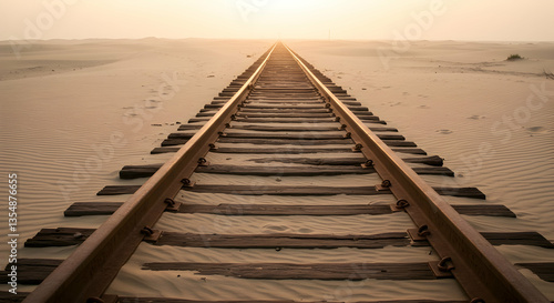 © Nancy, Fototapeta premium Railway Tracks Stretching Through Desert Landscape at Sunset with Warm Light