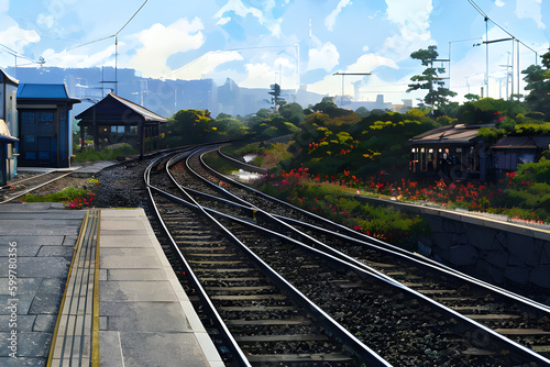 Naklejka premium Railway train station in the countryside in a clear blue sky Generated Ai