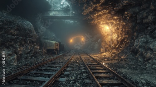 Naklejka premium Railway tunnel with dim lighting and rocky walls