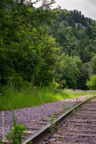 © dina, Obraz premium Railway with a background of green trees and a clear sky