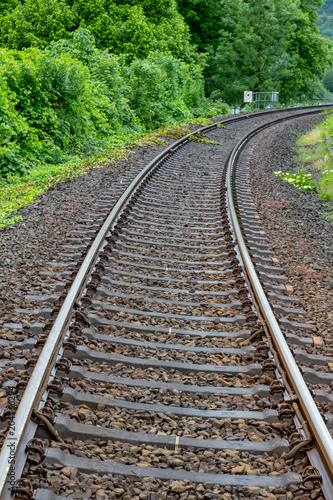 © Markus, Fototapeta premium Railway with a stony railbed in the green forest