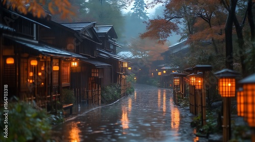 Naklejka premium Rain drenched lane with glowing lanterns illuminates traditional Japanese houses