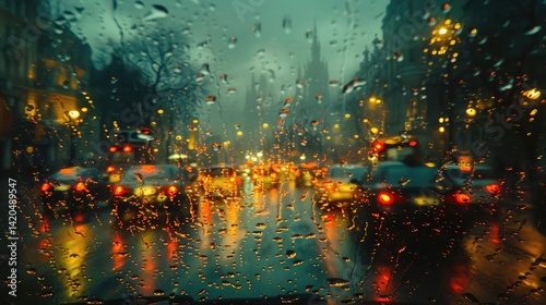 © Diyra - creations, Obraz premium Rain droplets on car window with blurred street lights