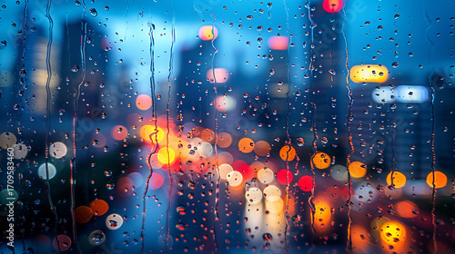 Obraz premium Rain drops on a window pane, night city lights, blurred view of a city.
