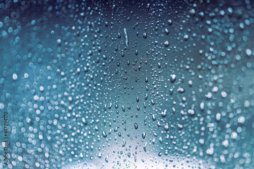 Fototapeta premium Rain drops on the window, rainy night with cool lights. Drop pattern.