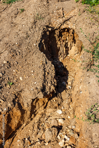 © PhotoChur, Naklejka premium Rain erosion of sandy soil on a slope