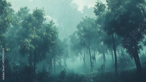 © irawan, Obraz premium Rain Falling on a Misty Forest Path
