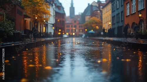 © Gatherina, Fototapeta premium Rain falling on city street at twilight with warm toned lights reflecting in puddles