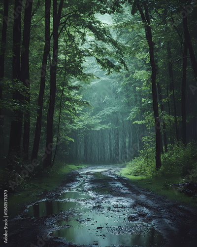 © utaem2022, Obraz premium Rain falling on muddy road in lush green forest