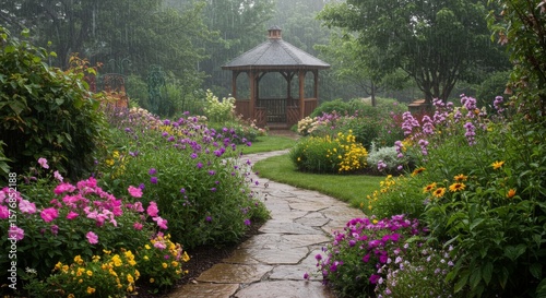 Naklejka premium Rain-Kissed Garden with Wooden Gazebo and Colorful Flowers