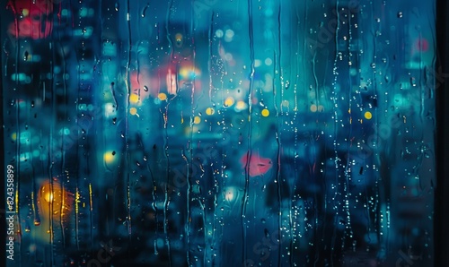 Fototapeta premium Rain pouring down on a window with city lights in the background