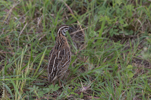 Fototapeta premium Rain quail or black-breasted quail (Coturnix coromandelica) at Bhigwan, Maharashtra, India.