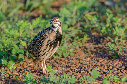 Fototapeta premium Rain Quail or Coturnix coromandelica, beautiful bird standing in meadow with...