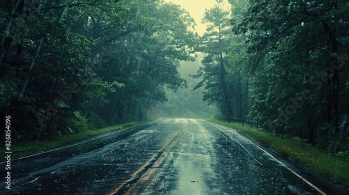 © TheWaterMeloonProjec, Obraz premium Rain road and trees in the image