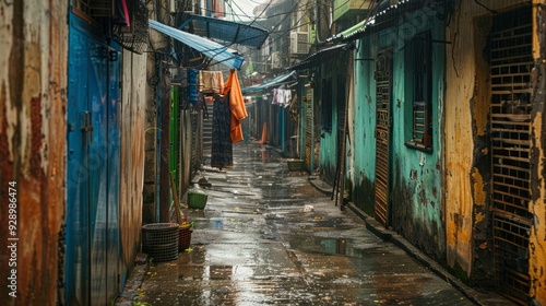 Fototapeta premium Rain-soaked alleyway with colorful laundry hanging in a narrow street of a vibrant neighborhood