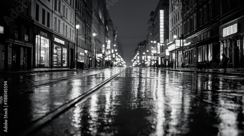 © Panithi, Fototapeta premium Rain-soaked City Street at Night with Glowing Lights and Reflections