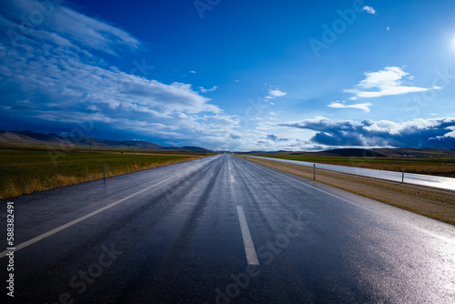 © Halilibrahimgunes, Naklejka premium rain-soaked highway and blue sky with clouds