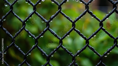 Fototapeta premium Rain-soaked metal grid fence with droplets, adding mood and atmosphere to an...