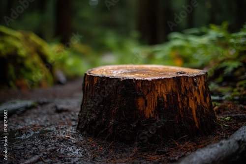 © Mr. Png, Fototapeta premium Rain-soaked tree stump in lush forest with dark green foliage and wet ground