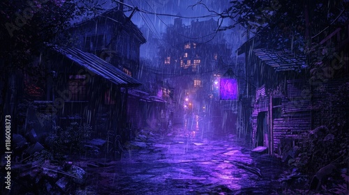 Naklejka premium Rain-soaked urban alley illuminated by neon purple lights and glowing windows, with reflections on wet pavement creating a moody and mysterious nighttime atmosphere. Perfect for cinematic and urban my