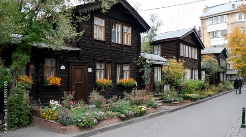 © lililia, Obraz premium Rain-soaked wooden houses line the sidewalk, showcasing the beauty of old town architecture amidst the vibrant autumn foliage
