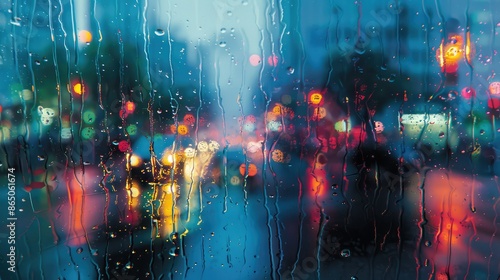© linda, Fototapeta premium Rain-splattered window with city lights in a blur