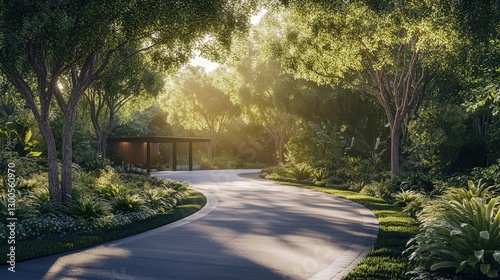 Obraz premium rain tree-lined driveway leading to a secluded retreat, with the sun...