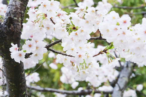 Obraz premium Rain, white cherry blossoms in bloom, spring scenery