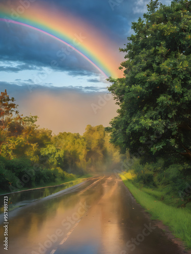 © LooPanda-Pictures, Obraz premium Rainbow after rain background with a blue sky