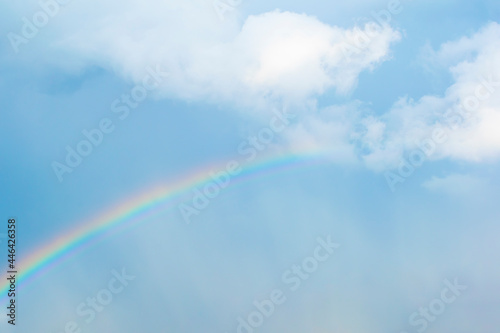 Naklejka premium Rainbow after the storm in the blue cloudy sky, with white cumulus.