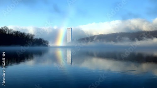 Fototapeta premium Rainbow Appears Over a Skyscraper Reflected in a Misty Lake with Trees and...