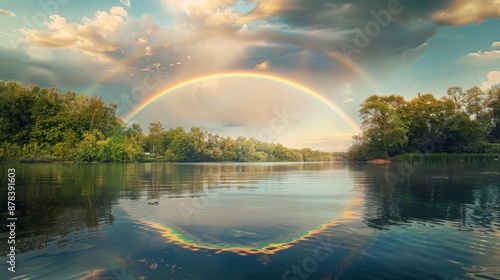 Naklejka premium rainbow arches over a quiet village by the sea, its colors adding a touch of...