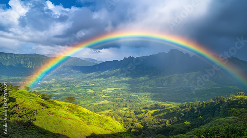 © Nelson, Naklejka premium Rainbow Arches Over Lush Valley Beneath Cloudy Sky in Hawaii