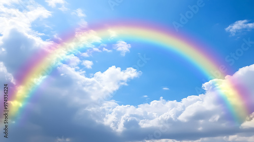 Naklejka premium Rainbow arching across a cloudy sky after a rainstorm, colorful weather...