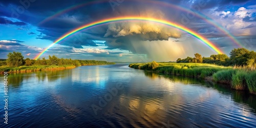 Naklejka premium Rainbow arcing over a calm river, nature, colorful, vibrant, scenery, water,...