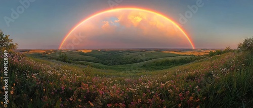 © upnowgraphics, Obraz premium Rainbow Arcing Over a Field of Wildflowers at Sunset