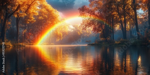 Obraz premium Rainbow Arcing Over a Misty Autumn Forest Lake