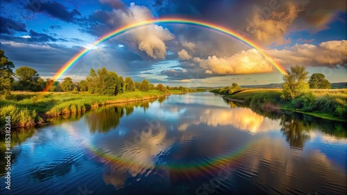 Naklejka premium Rainbow arcing over a tranquil river, rainbow, river, colorful, vibrant, nature, scenery, reflection, peaceful, beauty, landscape