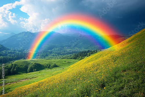 Naklejka premium Rainbow Arcing Over Lush Green Mountain Meadow