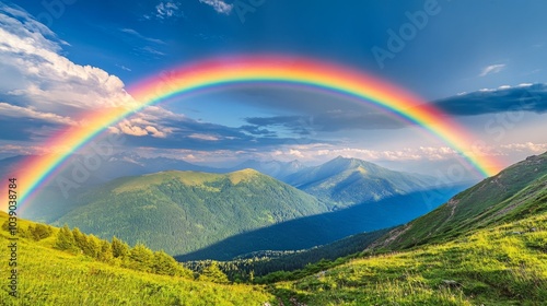 Fototapeta premium Rainbow Arcing Over Lush Green Mountains