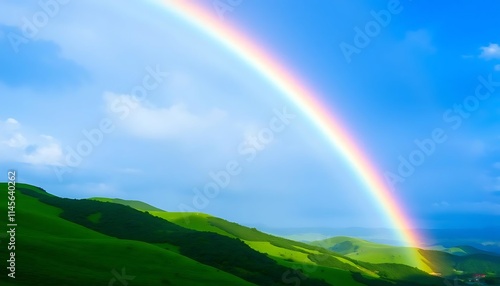 Obraz premium Rainbow Arcing Over Lush Green Rolling Hills