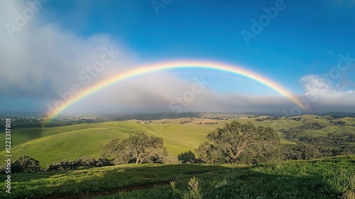 Naklejka premium Rainbow Arcing Over Rolling Green Hills And Trees