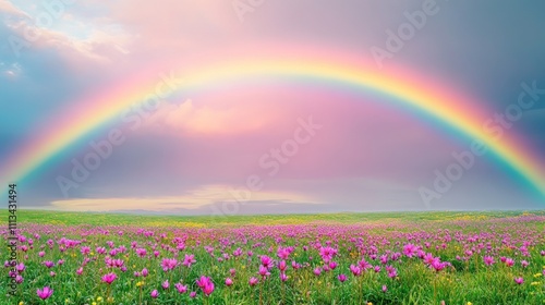 © Rere_Art151, Naklejka premium Rainbow Arcs Over Vibrant Wildflower Meadow