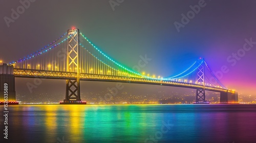 Fototapeta premium Rainbow Bay Bridge Night, Cityscape, Fog, Lights, Reflection