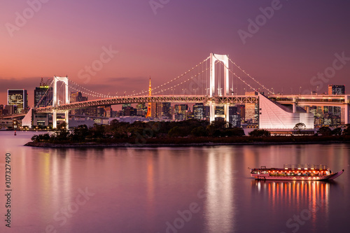 © Anton Petrus, Obraz premium Rainbow Bridge and Sumida River in Tokyo, Japan. Night photo.