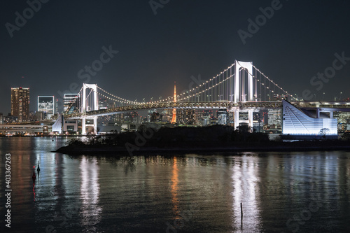 Fototapeta premium Rainbow Bridge and Tokyo Tower at night viewed from Odaiba お台場から観たレインボーブリッジと東京タワー 夜景
