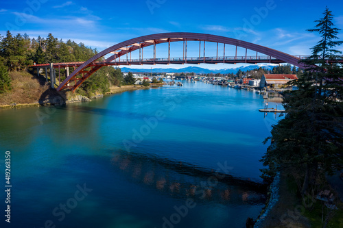 © LoweStock, Fototapeta premium Rainbow Bridge in the Town of La Conner, Washington. Rainbow Bridge connects Fidalgo Island and La Conner, crossing Swinomish Channel in Skagit County. National Register of Historic Places.
