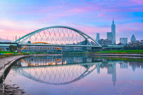Obraz premium Rainbow Bridge, landscape view of long bridge lies across the Keelung river with colorful sunset sky at Songshan district, Taipei City, Taiwan