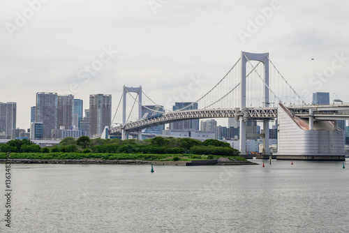 Naklejka premium Rainbow Bridge over Tokyo Bay connects Shibaura and Odaiba. Completed in 1993, its a vital infrastructure and a landmark