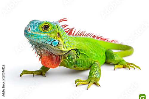 © Oksana_Latysheva, Obraz premium Rainbow color reptilian Iguana sitting on white backdrop